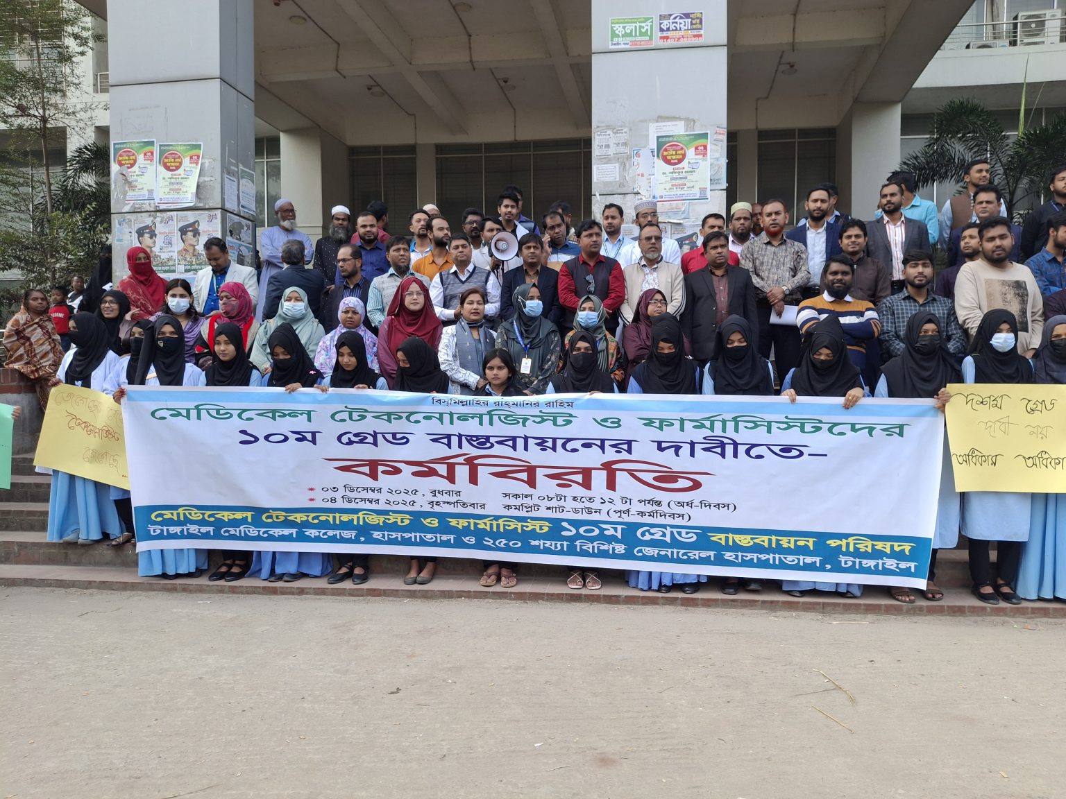 টাঙ্গাইল মেডিকেল কলেজ হাসপাতাল ও ২৫০ শয্যার জেনারেল হাসপাতালে কর্মরত মেডিকেল টেকনোলজিস্ট ও ফার্মাসিস্টরা ১০ম গ্রেড বাস্তবায়নের দাবিতে কর্মবিরতি পালন করেছেন। বুধবার (০৩ ডিসেম্বর) সকাল ১০টা থেকে দুপুর ১২টা পর্যন্ত আংশিক কর্মবিরতি এবং বৃহস্পতিবার (০৪ ডিসেম্বর) পূর্ণদিবস কর্মবিরতি কর্মসূচি পালন করার ঘোষনা দেন। বুধবার হাসপাতাল চত্বরে অবস্থান নিয়ে টেকনোলজিস্ট ও ফার্মাসিস্টরা বেতন গ্রেড বৈষম্য দূরীকরণ এবং দ্রুত ১০ম গ্রেড বাস্তবায়নের দাবি জানান। তারা বলেন, দীর্ঘদিন ধরে দাবি জানিয়ে আসলেও এখনো তা কার্যকর না হওয়ায় পেশাগত উন্নতি ও ন্যায্য প্রাপ্তি থেকে বঞ্চিত হচ্ছেন তারা। বক্তারা আরও জানান, স্বাস্থ্যসেবায় গুরুত্বপূর্ণ ভূমিকা পালন করলেও অন্যান্য ক্যাডার ও পেশার তুলনায় তাদের বেতন কাঠামোতে বৈষম্য…
