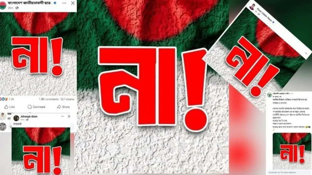 বুধবার (২৯ অক্টোবর) রাত থেকেই বিএনপি ও এর অঙ্গসংগঠনগুলোর নেতাকর্মীদের ফেসবুক প্রোফাইল ভরে উঠেছে ‘না’ লেখা পোস্টারে। প্রায় সবাই একই ধরনের ফটোকার্ড শেয়ার করছেন এবং মন্তব্যে নিজেদের অবস্থান জানাচ্ছেন।